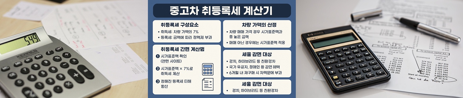 중고차를 구매할 때 차량 가격만 고려하면 안 됩니다. 구매 후 반드시 납부해야 하는 세금 중 하나가 바로 ‘취등록세’입니다. 이 글에서는 구글 SEO 및 네이버 지식스니펫에 최적화된 형식으로, 중고차 취등록세의 계산 방법과 온라인 계산기 활용법, 절세 팁까지 상세히 안내드립니다.